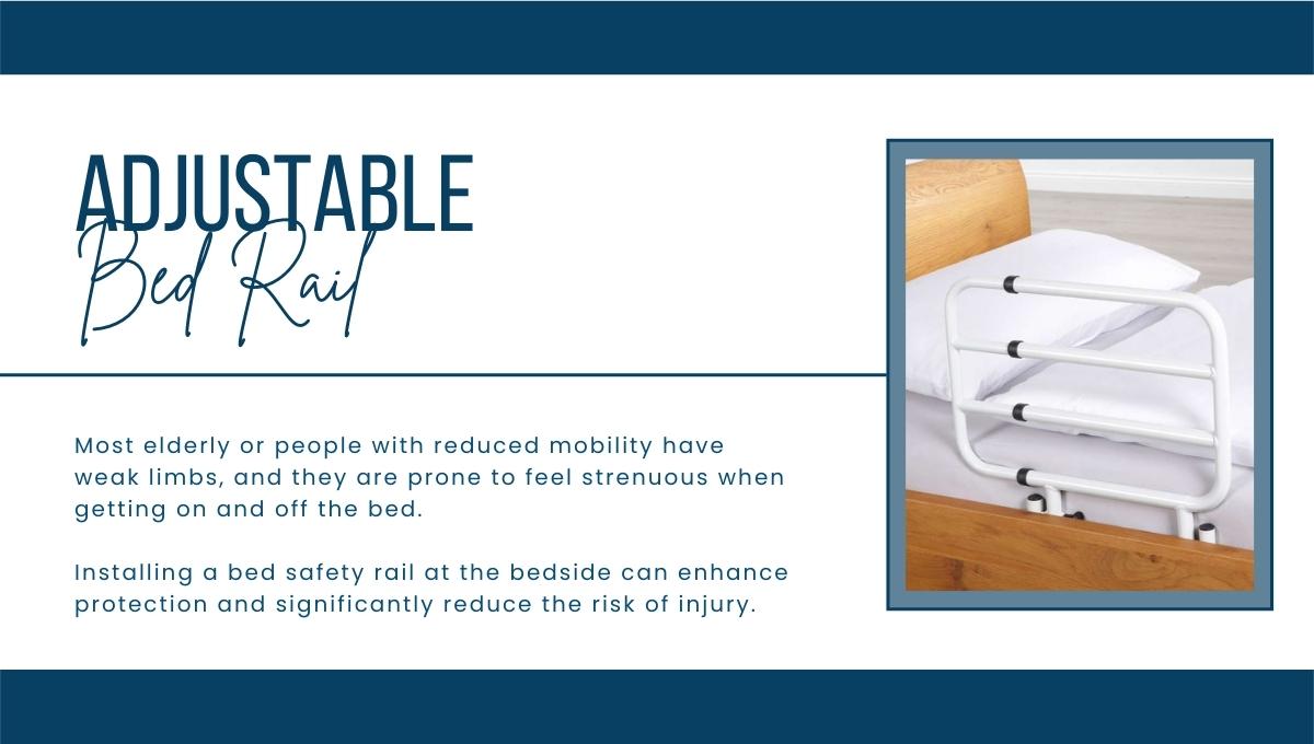 The bed rail is designed to help users get in and out of bed safely and securely, it works well as a side rail for preventing falls, and as a support bar for getting in and out of bed. Adding a support rail to a bed gives caregivers peace of mind because it helps keep loved ones safe. Each unit includes a securing strap that is riveted to the bed rail and designed to attach the bed to the rail to the bed frame or platform. The rail folds down and out of the way when it is not in use - a great feature when it's time to make the bed.